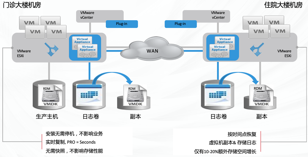 院區(qū)內(nèi)兩個機房需要協(xié)同保障業(yè)務(wù)連續(xù)性,同時要能防范因人為誤操作導致 重大損失的災(zāi)難,并能決速恢復(fù)系統(tǒng)。